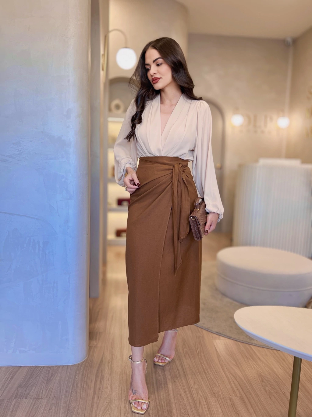 A saia transpassada é perfeita para criar looks sofisticados e modernos. Combine com tênis e t-shirt para um visual fashionista ou com uma bota poderosa e uma camisa clássica para um visual que transita do dia para a noite com facilidade!