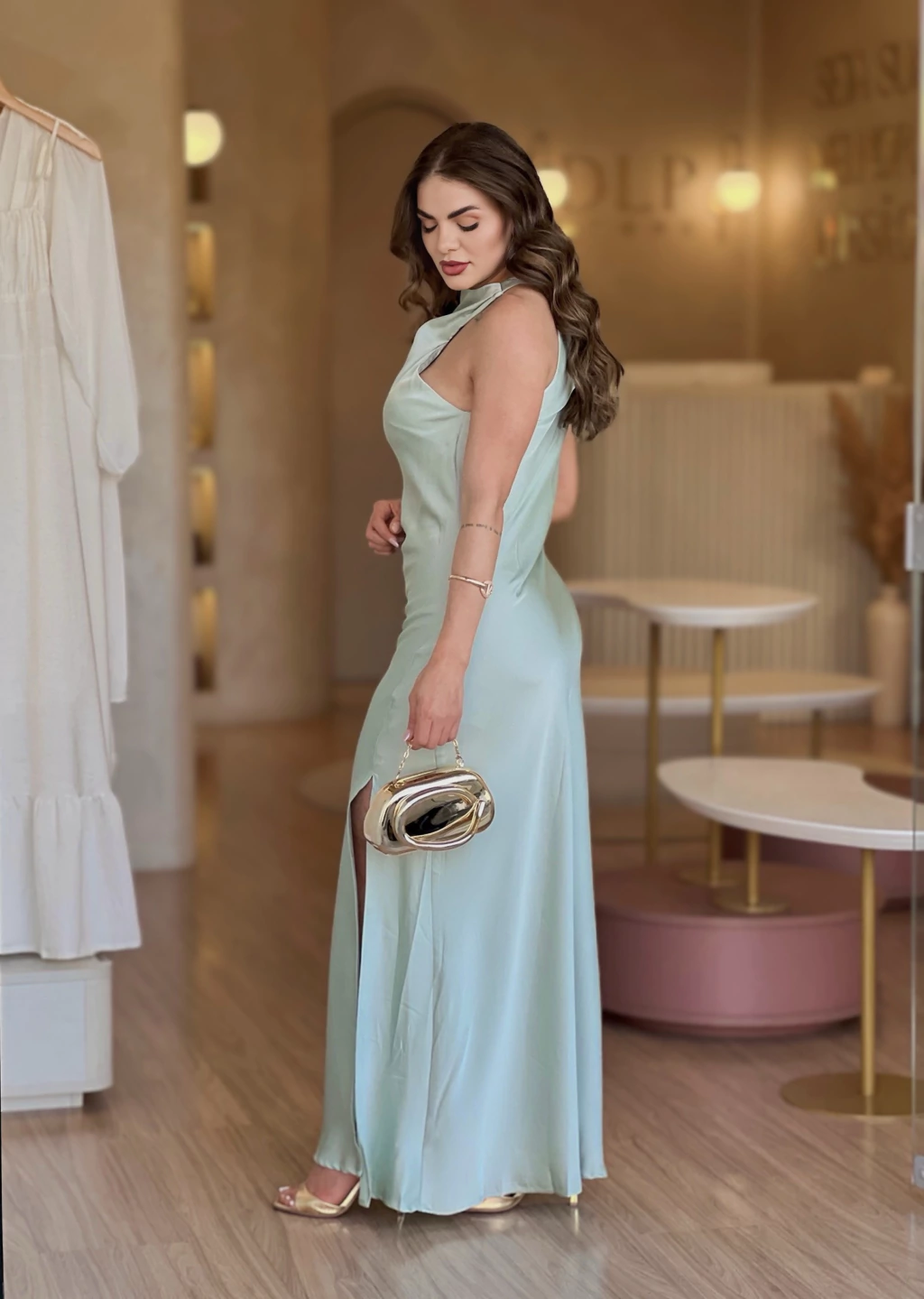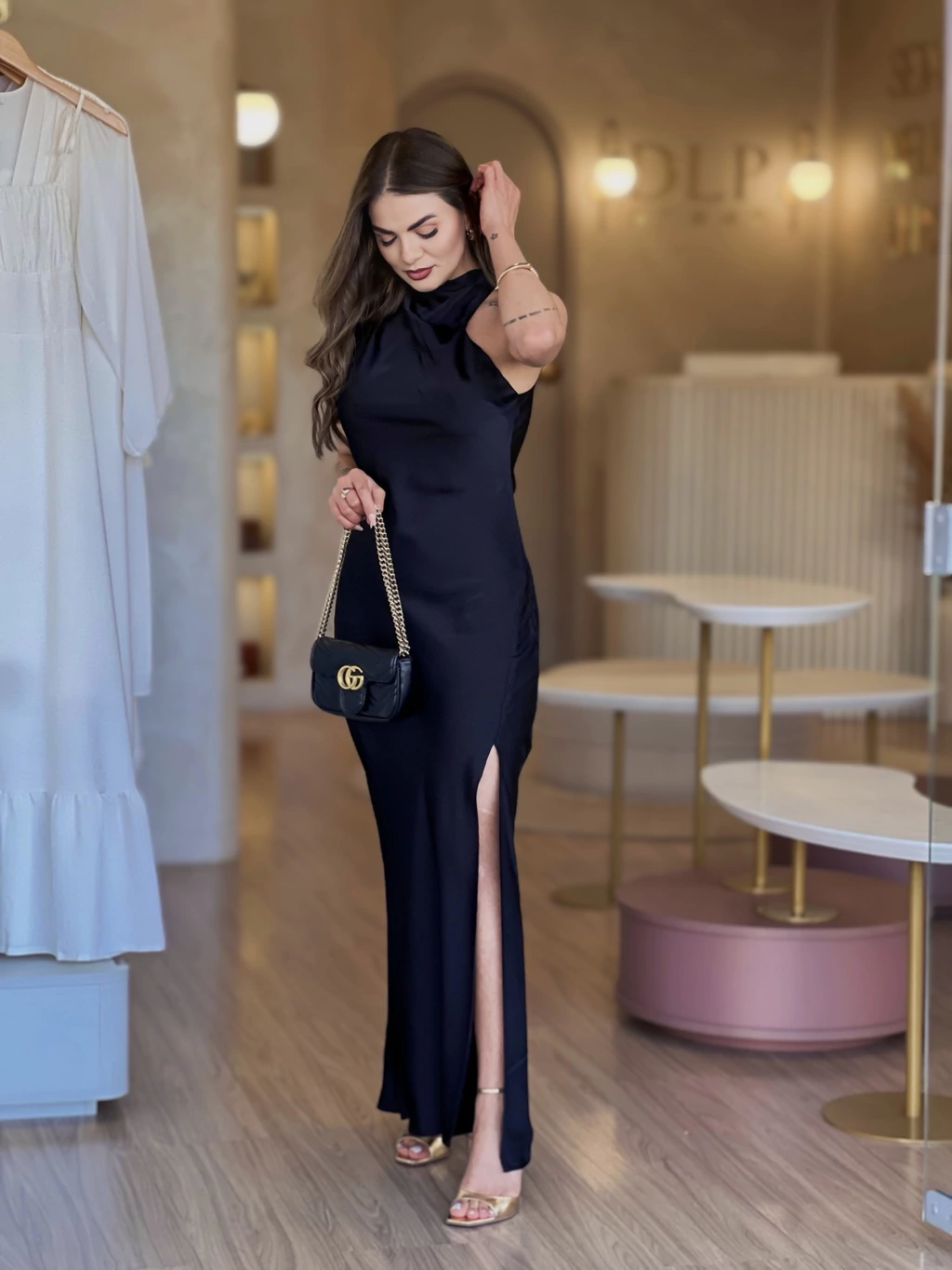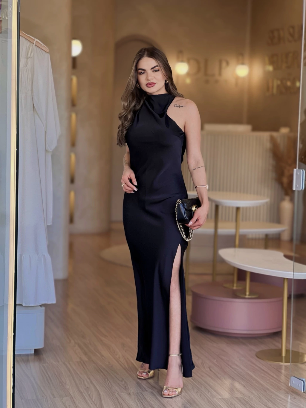 Vestido longo em cetim leve e fluido, com caimento sofisticado e elegante. Possui gola mais fechada com drapeado delicado que valoriza o busto e traz simetria ao design. O modelo conta ainda com fenda frontal lateral que garante charme e movimento, além de zíper nas costas para melhor ajuste. Uma peça versátil e refinada, perfeita para casamentos, jantares, eventos especiais ou até almoços em família, unindo conforto e elegância em cada detalhe.